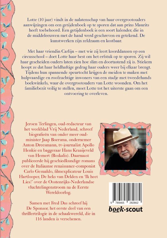 Lotte (10 jaar) vindt in de nalatenschap van haar overgrootouders aanwijzingen om een getijdenboek op te sporen dat aan prins Maurits heeft toebehoord. Een getijdenboek is een soort kalender, die in de middeleeuwen met de hand werd geschreven en getekend. De kunstwerken zijn zeldzaam en kostbaar. Met haar vriendin Carlijn – met wie zij leert koorddansen op een circusschool – doet Lotte haar best om het erfstuk op te sporen. Zij wil haar gescheiden ouders laten zien hoe slim en doortastend zij is. Stiekem hoopt ze dat haar heldhaftige gedrag haar ouders weer bij elkaar brengt. Tijdens hun spannende speurtocht krijgen de meiden te maken met hulpvaardige en roofzuchtige inwoners van een stadje met tweedehands boekwinkels, waar de overgrootouders van Lotte woonden. Om het familiebezit veilig te stellen, moet Lotte tot het uiterste gaan om een ontvoering te overleven.