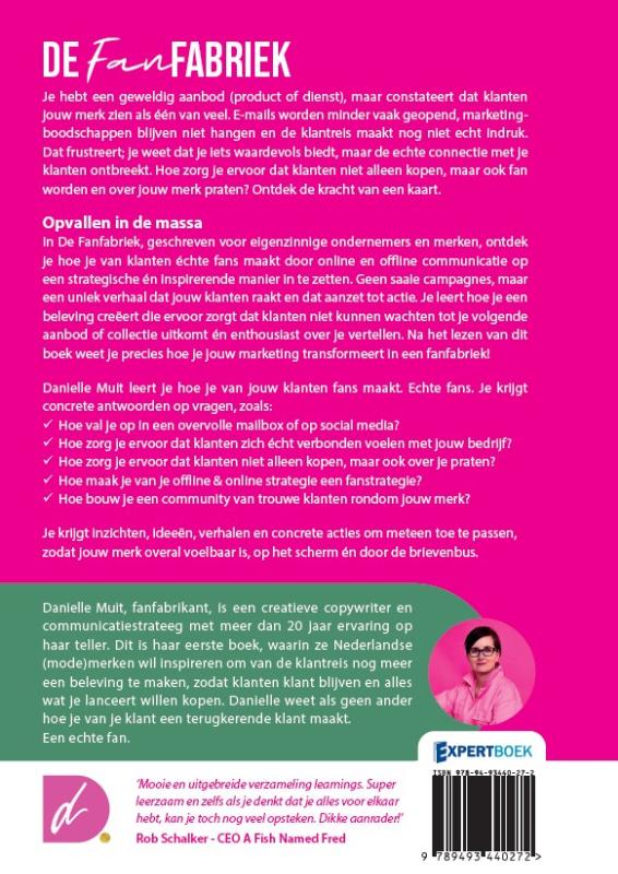 DE FANFABRIEK Je hebt een geweldig aanbod (product of dienst), maar constateert dat klanten jouw merk zien als één van veel. E-mails worden minder vaak geopend, marketingboodschappen blijven niet hangen en de klantreis maakt nog niet echt indruk. Dat frustreert; je weet dat je iets waardevols biedt, maar de echte connectie met je klanten ontbreekt. Hoe zorg je ervoor dat klanten niet alleen kopen, maar ook fan worden en over jouw merk praten? Ontdek de kracht van een kaart. Opvallen in de massa  In De Fanfabriek, geschreven voor eigenzinnige ondernemers en merken, ontdek je hoe je van klanten échte fans maakt door online en offline communicatie op een strategische én inspirerende manier in te zetten. Geen saaie campagnes, maar een uniek verhaal dat jouw klanten raakt en dat aanzet tot actie. Je leert hoe je een beleving creëert die ervoor zorgt dat klanten niet kunnen wachten tot je volgende aanbod of collectie uitkomt én enthousiast over je vertellen. Na het lezen van dit boek weet je precies hoe je jouw marketing transformeert in een fanfabriek. Danielle Muit leert je hoe je van jouw klanten fans maakt, Echte fans. Je krijgt concrete antwoorden op vragen, zoals: Hoe val je op in een overvolle mailbox of op social media? Hoe zorg je ervoor dat klanten zich echt verbonden voelen met jouw bedrijf? Hoe zorg je ervoor dat klanten niet alleen kopen, maar ook over je praten? Hoe maak je van je offline & online strategie een fanstrategie? Hoe bouw je een community van trouwe klanten rondom jouw merk? Je krijgt inzichten, ideeën, verhalen en concrete acties om meteen toe te passen, zodat jouw merk overal voelbaar is, op het scherm én door de brievenbus. Danielle Muit, fanfabrikant, is een creatieve copywriter en communicatiestrateeg met meer dan 20 jaar ervaring op haar teller. Dit is haar eerste boek, waarin ze Nederlandse (mode)merken wil inspireren om van de klantreis nog meer een beleving te maken, zodat klanten klant blijven en alles wat je lanceert willen kopen. Danielle weet als geen ander hoe je van je klant een terugkerende klant maakt. Een echte fan.