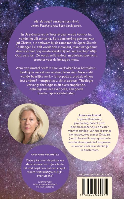 Met de trage hartslag van een vinvis zwemt Parakleta haar baan om de aarde. In De geboorte van de Trooster gaan we de kosmos in, vondeling Lili achterna. Ze is een leerling geweest van juf Christa, die omkwam bij de ramp met de spaceshuttle Challenger. Lili zelf wordt ook astronaut, maar wat gebeurt daar voor het oog van de wereld bij het ruimteschip? ‘Mijn God, ze is los!’ Zo wordt ze Parakleta, middelaar, toevlucht, trooster voor de belaagde mens. Anne van Amstel heeft in haar werk altijd haar betrokkenheid bij de wereld van vandaag laten zien. Maar in dit wonderbaarlijke werk – is het poëzie, proëzie of nog iets anders? – ontpopt ze zich tot apostel. Thealogie vervangt theologie in dit overrompelende, onheilige nieuwe evangelie; een goede boodschap in kwade tijden. Anne van Amstel is gezondheidszorgpsycholoog, docent postdoctoraal onderwijs en dichter van vier bundels, van Het oog van de storm (2004) tot en met Trapezista (2022). Ze werd in 1974 geboren in een domineesgezin te Hoogeveen, en woont sinds haar studietijd in Amsterdam. Over Anne van Amstel: ‘De jury kan over de poëzie van deze laureaat kort zijn: alles in dit werk wijst naar dat ene simpele woord “waarachtig-werkelijk-overtuigend”.’ Juryrapport Hollands Maandblad Schrijversbeurs Over Geef me nu ik wil: ‘Van Amstel wil schoonheid vinden tussen de rommel, graven in de aarde en zich God wanen, waar ze elders haar lot in de handen van de kunstenaar legt. (…) Toch tonen Van Amstels stellig geformuleerde verzoeken evengoed kwetsbaarheid.’ Janita Monna, Trouw ‘Met haar derde dichtbundel toont Anne van Amstel zich een dwingende observator. (…) Van Amstel laat iets in de lezer zwijgen. En zinderen: een hertshoornvaren sterft / waar je haar aanraakt.’ Maria Barnas, de Volkskrant Over Trapezista: ‘Met deze helderheid, een hint van humor en een flinke dosis weemoed, loodst Van Amstel de lezer de bundel door, die de lezer toch steeds meer naar zich toe weet te trekken, totdat de zinnen bijna onder je huid kruipen.’ Nora van Arkel, Awater