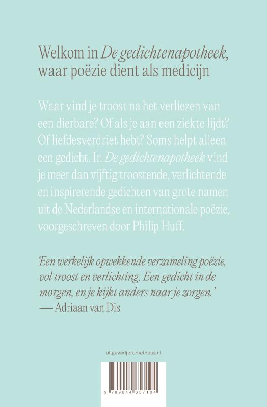 Welkom in De gedichtenapotheek, waar poëzie dient als medicijn Waar vind je troost na het verliezen van een dierbare? Of als je aan een ziekte lijdt? Of liefdesverdriet hebt? Soms helpt alleen een gedicht. In De gedichtenapotheek vind je meer dan vijftig troostende, verlichtende en inspirerende gedichten van grote namen uit de Nederlandse en internationale poëzie, voorgeschreven door Philip Huff. Philip Huff is schrijver en regisseur. Hij publiceerde vijf romans, waaronder Niemand in de stad, Wat je van bloed weet en Open, een verhalenbundel, een essaybundel, een dichtbundel en een novelle. Huff schreef het scenario voor de veelgeprezen verfilming van Niemand in de stad. Hij regisseerde twee korte films, Bosrandgeluk en Het kamp. Momenteel werkt hij aan zijn eerste speelfilm als scenarist en regisseur. ‘Een werkelijk opwekkende verzameling poëzie, vol troost en verlichting. Een gedicht in de morgen, en je kijkt anders naar je zorgen.’ Adriaan van Dis