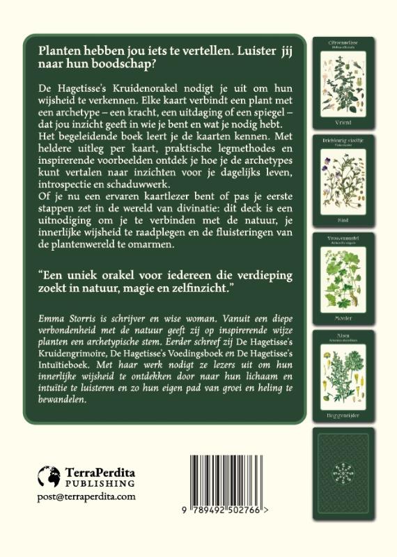 Planten hebben jou iets te vertellen. Luister jij naar hun boodschap? Planten zijn meer dan geneeskrachtige bondgenoten. Ze dragen verhalen en wijsheden in zich die ons iets leren over onszelf en onze weg door het leven. De Hagetisse’s Kruidenorakel nodigt je uit om die diepere laag te verkennen. Elke kaart verbindt een plant met een archetype – een kracht, een uitdaging of een spiegel – dat jou inzicht geeft in wie je bent en wat je nodig hebt. Het begeleidende boek laat je stap voor stap kennismaken met de kaarten. Met heldere uitleg per kaart, praktische legmethodes en inspirerende voorbeelden ontdek je hoe je de archetypes van planten kunt vertalen naar inzichten voor je dagelijks leven, introspectie en schaduwwerk. Of je nu een ervaren kaartlezer bent of pas je eerste stappen zet in de wereld van divinatie: dit deck is een uitnodiging om je te verbinden met de natuur, je innerlijke wijsheid te raadplegen en de fluisteringen van de plantenwereld te omarmen. Een uniek orakel voor iedereen die verdieping zoekt in natuur, magie en zelfinzicht. 58 kaarten en een boek van 175 pagina's inclusief notities in een mooie bewaardoos.