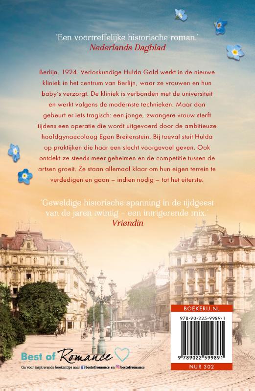 Voor de kijkers van de successerie Call the Midwife Berlijn, 1924. Verloskundige Hulda Gold werkt in de nieuwe kliniek in het centrum van Berlijn, waar ze vrouwen en hun baby’s verzorgt. De kliniek is verbonden met de universiteit en werkt volgens de modernste technieken. Maar dan gebeurt er iets tragisch: een jonge, zwangere vrouw sterft tijdens een operatie die wordt uitgevoerd door de ambitieuze hoofdgynaecoloog Egon Breitenstein. Bij toeval stuit Hulda op praktijken die haar een slecht voorgevoel geven. Ook ontdekt ze steeds meer geheimen en de competitie tussen de artsen groeit. Ze staan allemaal klaar om hun eigen terrein te verdedigen en gaan – indien nodig – tot het uiterste. ‘Een voortreffelijke historische roman.’ Nederlands Dagblad ‘Geweldige historische spanning in de tijdgeest van de jaren twintig — een intrigerende mix.’ Vriendin
