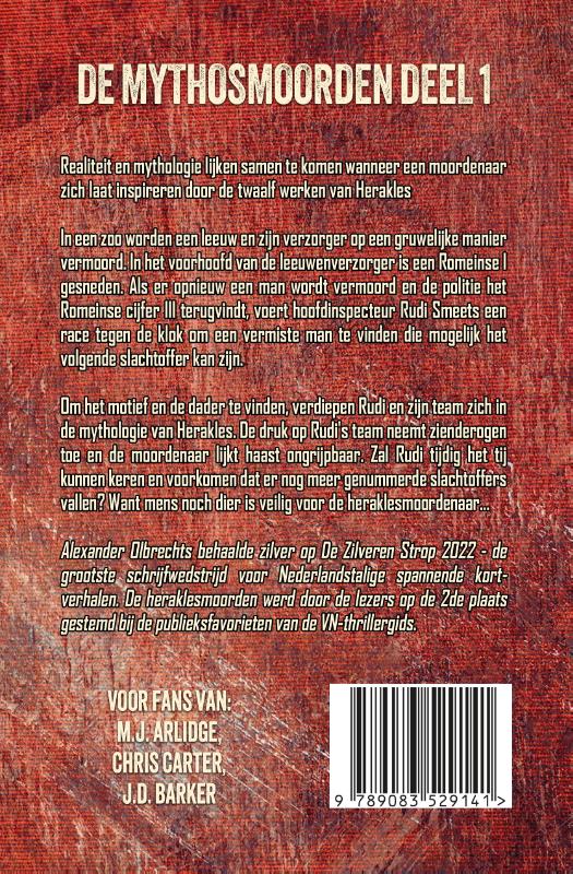 Realiteit en mythologie lijken samen te komen wanneer een moordenaar zich laat inspireren door de twaalf werken van Herakles. In een zoo worden een leeuw en zijn verzorger op een gruwelijke manier vermoord. In het voorhoofd van de leeuwenverzorger is een Romeinse I gesneden. Als er opnieuw een man wordt vermoord en de politie het Romeinse cijfer III terugvindt, voert hoofdinspecteur Rudi Smeets een race tegen de klok om een vermiste man te vinden die mogelijk het volgende slachtoffer kan zijn. Om het motief en de dader te vinden, verdiepen Rudi en zijn team zich in de mythologie van Herakles. De druk op Rudi's team neemt zienderogen toe en de moordenaar lijkt haast ongrijpbaar. Zal Rudi tijdig het tij kunnen keren en voorkomen dat er nog meer genummerde slachtoffers vallen? Want mens noch dier is veilig voor de heraklesmoordenaar... Alexander Olbrechts behaalde zilver op De Zilveren Strop 2022 - de grootste schrijfwedstrijd voor Nederlandstalige spannende kort- verhalen. De heraklesmoorden werd door de lezers op de 2de plaats gestemd bij de publieksfavorieten van de VN-thrillergids.