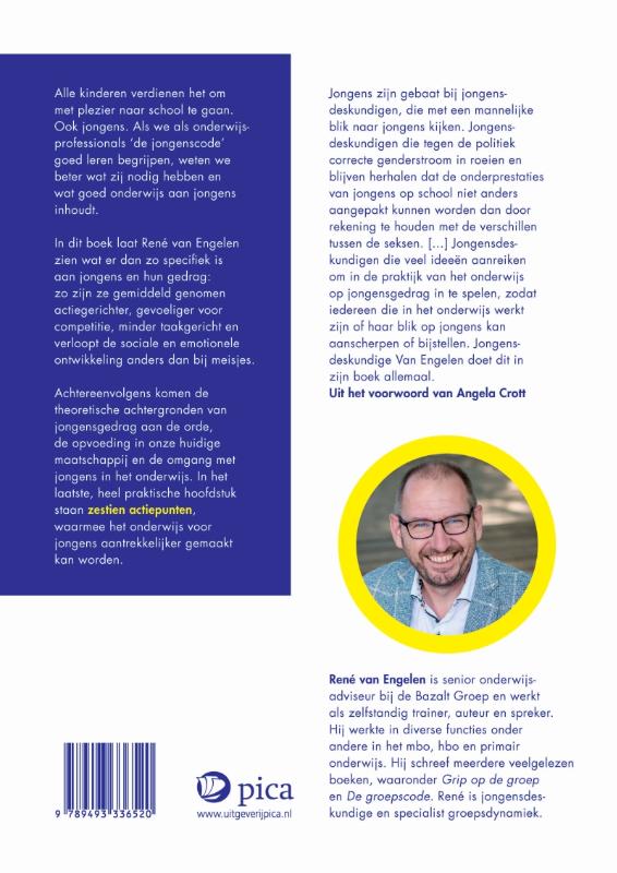 Alle kinderen verdienen het om met plezier naar school te gaan. Ook jongens. Als we als onderwijsprofessionals ‘de jongenscode’ goed leren begrijpen, weten we beter wat zij nodig hebben en wat goed onderwijs aan jongens inhoudt. In dit boek laat René van Engelen zien wat er dan zo specifiek is aan jongens en hun gedrag: zo zijn ze gemiddeld genomen actiegerichter, gevoeliger voor competitie, minder taakgericht en verloopt de sociale en emotionele ontwikkeling anders dan bij meisjes. Achtereenvolgens komen de theoretische achtergronden van jongensgedrag aan de orde, de opvoeding in onze huidige maatschappij en de omgang met jongens in het onderwijs. In het laatste, heel praktische hoofdstuk staan zestien actiepunten, waarmee het onderwijs voor jongens aantrekkelijker gemaakt kan worden.