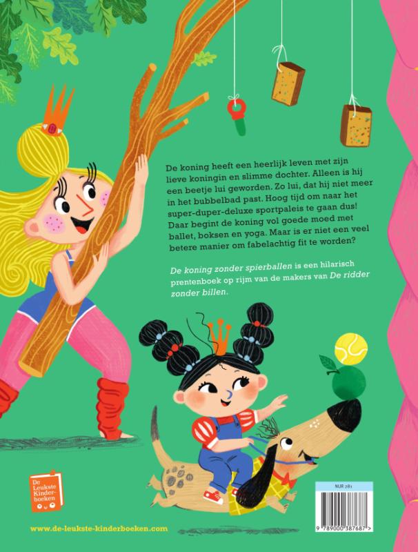Een nieuw avontuur van de makers van De ridder zonder billen ! De koning heeft het helemaal voor elkaar: een lieve koningin aan zijn zij, een slimme dochter die keurig haar best doet tijdens haar prinsessenlessen én een uitstekend paar billen. Maar hij is ook een beetje lui geworden. Zo lui, dat hij inmiddels eigenlijk niet meer zo goed in het bubbelbad past. Gelukkig weet de koningin wel raad: tijd om naar het sportpaleis te gaan! Daar start de koning vol goede moed met ballet, boksen en yoga. Maar is er niet een veel betere manier om spierballen te kweken? De koning zonder spierballen is een hilarisch prentenboek op rijm over waarom buitenspelen misschien wel de állerbeste sport is! Met spectaculaire uitklappagina van het sportpaleis. Van de boeken uit deze succesvolle serie werden al ruim 150.000 exemplaren verkocht! Lees ook de andere delen uit de Ridder zonder billen- serie: De ridder zonder billen De prins zonder billen Het prinsesje zonder stank De ridder zonder billen - kartonboek De ridder zonder billen – doeboek