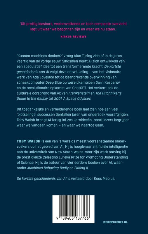 ‘Kunnen machines denken?’ vroeg Alan Turing zich af in de jaren veertig van de vorige eeuw. Sindsdien heeft ai zich ontwikkeld van een speculatief idee tot een transformerende kracht. De kortste geschiedenis van ai volgt deze ontwikkeling – van het visionaire werk van Ada Lovelace tot de baanbrekende overwinning van schaakcomputer Deep Blue op wereldkampioen Garry Kasparov en de revolutionaire opkomst van Chatgpt. Het verkent ook de culturele oorsprong van ai: van Frankenstein en The Hitchhiker’s Guide to the Galaxy tot 2001: A Space Odyssey . Dit toegankelijke en verhelderende boek laat zien hoe aan veel ‘plotselinge’ successen tientallen jaren van onderzoek voorafgingen. Toby Walsh brengt ai terug tot zes kernideeën, zodat lezers begrijpen waar we vandaan komen – en waar we naartoe gaan.