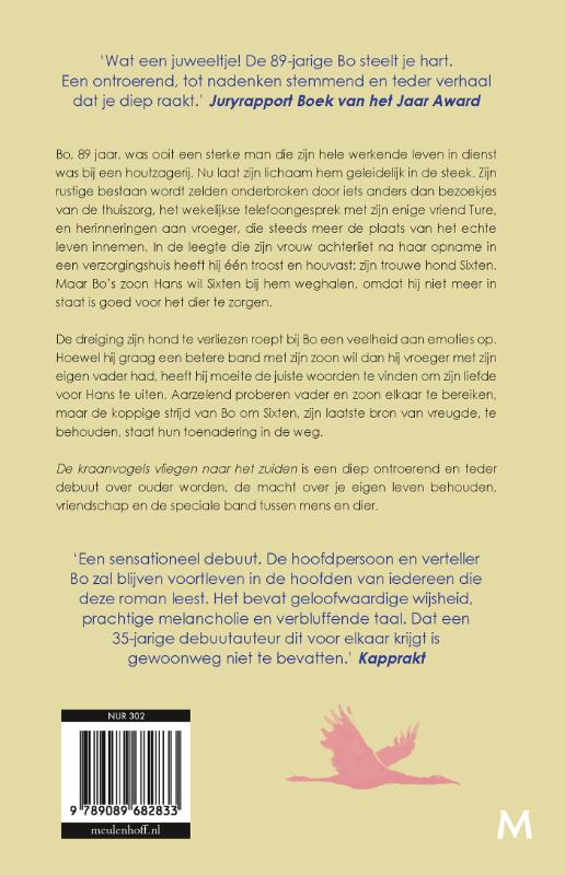 Verkozen tot Roman van het Jaar 2024 in Zweden ‘Wat een juweeltje! De 89-jarige Bo steelt je hart. Een ontroerend, tot nadenken stemmend en teder verhaal dat je diep raakt.’ Juryrapport Boek van het Jaar Award Bo, 89 jaar, was ooit een sterke man die zijn hele werkende leven in dienst was bij een houtzagerij. Nu laat zijn lichaam hem geleidelijk in de steek. Zijn rustige bestaan wordt zelden onderbroken door iets anders dan bezoekjes van de thuiszorg, het wekelijkse telefoongesprek met zijn enige vriend Ture, en herinneringen aan vroeger, die steeds meer de plaats van het echte leven innemen. In de leegte die zijn vrouw achterliet na haar opname in een verzorgingshuis heeft hij één troost en houvast: zijn trouwe hond Sixten. Maar Bo’s zoon Hans wil Sixten bij hem weghalen, omdat hij niet meer in staat is goed voor het dier te zorgen. De dreiging zijn hond te verliezen roept bij Bo een veelheid aan emoties op. Hoewel hij graag een betere band met zijn zoon wil dan hij vroeger met zijn eigen vader had, heeft hij moeite de juiste woorden te vinden om zijn liefde voor Hans te uiten. Aarzelend proberen vader en zoon elkaar te bereiken, maar de koppige strijd van Bo om Sixten, zijn laatste bron van vreugde, te behouden, staat hun toenadering in de weg. De kraanvogels vliegen naar het zuiden is een diep ontroerend en tedere roman over ouder worden, de macht over je eigen leven behouden, vriendschap en de speciale band tussen mens en dier. Boehandel en pers ‘Het ontroerende romandebuut De kraanvogels vliegen naar het zuiden won meerdere prijzen in eigen land, werd uitgeroepen tot Boek van het Jaar 2024 en verschijnt nu in 34 talen.’ Het Parool 'Een ontroerend boek, vol melancholie en menselijkheid. Traantje weggepinkt.' Rik van de Westelaken ‘Dit succesdebuut is een lofzang op de toewijding van de thuiszorg, en een boek over drie generaties mannen.’ Trouw ‘Prachtig. Mooi verteld, vol emoties.’ Anne de Jager, Boekhandel de Vries Zierikzee ‘Dit boek laat je in de belevingswereld van iemand met dementie stappen. Heel waardevol! De verslagjes van de thuiszorg maken het geheel nog inzichtelijker en weven het tot een prachtig boek!’ Josette Aerts, Boekhandel Dominicanen ‘Prachtig, geloofwaardig portret van een wankele vader-zoonrelatie.’ Zin Magazine ‘In haar debuutroman De kraanvogels vliegen naar het zuiden schetst de Zweedse schrijfster Lisa Ridzén het verhaal op een beheerste en liefdevolle manier.’ Noordhollands Dagblad / Leidsch Dagblad / Gooi- en Eemlander ‘Bo's pogingen om zijn zoon naderbij te komen en hem zijn liefde te betonen, zonder daarvoor de woorden of middelen in huis te hebben, zijn hartverwarmend beschreven. Het maakt maar weer eens duidelijk dat liefde voor onze naasten onze belangrijkste brandstof is.’ Happinez ‘Een mooi debuut van een jonge schrijfster, die de ouderdomslasten en de soms bijkomende betutteling treffend verwoordt.’ MAX Magazine ‘Een sensationeel debuut. De hoofdpersoon en verteller Bo zal blijven voortleven in de hoofden van iedereen die deze roman leest. Het bevat geloofwaardige wijsheid, prachtige melancholie en verbluffende taal. Dat een 35-jarige debuutauteur dit voor elkaar krijgt is gewoonweg niet te bevatten.’ Kapprakt ‘Een hartverscheurend mooi, ontroerend verhaal over de laatste zomer van een oude man. Een boek dat door iedereen gelezen zou moeten worden.’ ***** Dagbladet ‘Alles aan het personage Bo voelt zo oprecht aan en we komen zo dicht bij hem. Diep ontroerend.’ Länstidningen Östersund ‘Soms werd ik zo gegrepen door zijn koppige strijd om zijn hond Sixten te behouden, zijn laatste bron van vreugde in het leven, dat ik het boek bijna moest neerleggen. Behalve een aangrijpende weergave van ouderdom is Lisa Ridzéns roman ook haast subversief, met een vleugje rebellie in de beschrijving van Bo.’ Gefle Dagblad ‘Een werkelijk ontroerende leeservaring, zo nuchter en oprecht als een nummer van Johnny Cash. Een boek dat ervoor zorgt dat je meteen je vader wilt bellen om te vragen hoe het met hem gaat.’ Dagens Næringsliv ‘Dit is een prachtige, aangrijpende en zeer actuele roman, waarvan velen van ons wijzer zullen worden. Het is epische literatuur, een dijk van een debuut.’ ****** Nettavisen ‘Een sterk en subtiel debuut dat de lezer recht in het hart raakt.’ ***** Verdens Gang ‘Een teder verhaal over ouder worden, en de verborgen wreedheid van de liefde. Over wat het betekent om een man te zijn, en om een mens te zijn, over vaders en zonen en vaders en honden. Het is een boek voor iedereen die afscheid heeft moeten nemen. Het soort boek dat je aan iemand geeft als je probeert te zeggen “ik heb aan je gedacht”.’ Fredrik Backman, auteur van Een man die Ove heet
