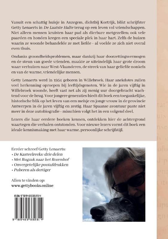 Vanuit een schattig huisje in Anzegem, dichtbij Kortrijk, blikt schrijfster Getty Lenaerts in De Laatste Halte terug op een leven vol vriendschappen. Niet alleen mensen kruisten haar pad als dierbare metgezellen; ook vele paarden en honden kregen een speciale plek in haar hart. Zelfs de huizen waarin ze woonde behandelde ze met liefde — al voelde ze zich niet overal even thuis. Ondanks gezondheidsproblemen, maar dankzij haar doorzettingsvermogen en de steun van goede vrienden, maakte ze uiteindelijk haar grote droom waar: verhuizen naar West-Vlaanderen, de streek van haar geliefde nonkels en van de warme, vriendelijke mensen. Getty Lenaerts werd in 1954 geboren in Willebroek. Haar anekdotes zullen veel herkenning oproepen bij leeftijdsgenoten. Wie in de jaren vijftig in Willebroek woonde, heeft vast net als zij menig uur doorgebracht wachtend voor de brug. Voor jongere generaties biedt dit boek een toegankelijke, historische blik op het leven van een meisje en jonge vrouw in de provincie Antwerpen in de jaren vijftig en zestig. Haar Spaanse avontuur paste niet meer in deze autobiografie — misschien volgt het in een volgend deel. Lezers die haar eerdere boeken kennen, ontdekken hier de achtergrond waartegen die verhalen ontstonden. Voor nieuwe lezers vormt dit boek een ideale kennismaking met haar warme, persoonlijke schrijfstijl.