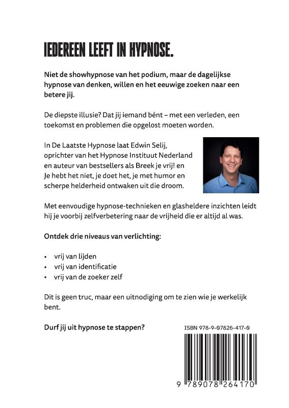IEDEREEN LEEFT IN HYPNOSE. Niet de showhypnose van het podium, maar de dagelijkse hypnose van denken, willen en het eeuwige zoeken naar een betere jij. De diepste illusie? Dat jij iemand bént – met een verleden, een toekomst en problemen die opgelost moeten worden. In De Laatste Hypnose laat Edwin Selij, oprichter van het Hypnose Instituut Nederland en auteur van bestsellers als Breek je vrij! en Je hebt het niet, je doet het, je met humor en scherpe helderheid ontwaken uit die droom. Met eenvoudige hypnose-technieken en glasheldere inzichten leidt hij je voorbij zelfverbetering naar de vrijheid die er altijd al was. Ontdek drie niveaus van verlichting: • vrij van lijden • vrij van identificatie • vrij van de zoeker zelf Dit is geen truc, maar een uitnodiging om te zien wie je werkelijk bent. Durf jij uit hypnose te stappen?