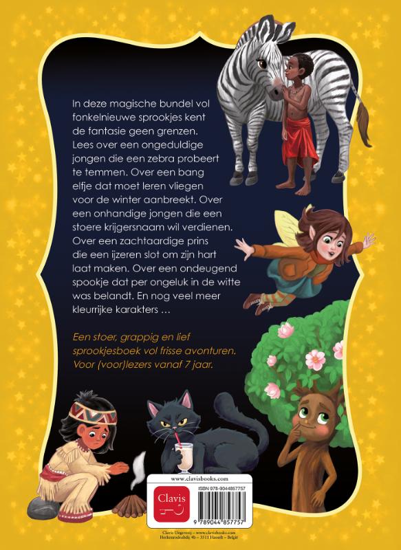 In deze magische bundel vol fonkelnieuwe sprookjes kent de fantasie geen grenzen. Lees over een ongeduldige jongen die een zebra probeert te temmen. Over een bang elfje dat moet leren vliegen voor de winter aanbreekt. Over een onhandige jongen die een stoere krijgersnaam wil verdienen. Over een zachtaardige prins die een ijzeren slot om zijn hart laat maken. Over een ondeugend spookje dat per ongeluk in de witte was belandt. En nog veel meer kleurrijke karakters … Een stoer, grappig en lief sprookjesboek vol frisse avonturen. Voor (voor)lezers vanaf 7 jaar.