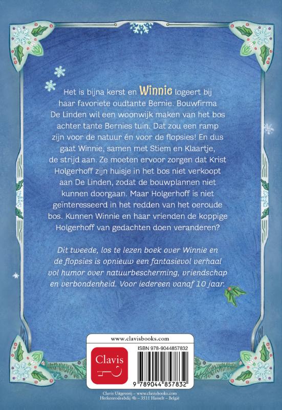 Het is bijna kerst en Winnie logeert bij haar favoriete oudtante Bernie. Bouwfirma De Linden wil een woonwijk maken van het bos achter tante Bernies tuin. Dat zou een ramp zijn voor de natuur én voor de flopsies! En dus gaat Winnie, samen met Stiem en Klaartje, de strijd aan. Ze moeten ervoor zorgen dat Krist Holgerhoff zijn huisje in het bos niet verkoopt aan De Linden, zodat de bouwplannen niet kunnen doorgaan. Maar Holgerhoff is niet geïnteresseerd in het redden van het oeroude bos. Kunnen Winnie en haar vrienden de koppige Holgerhoff van gedachten doen veranderen? Dit tweede, los te lezen boek over Winnie en de flopsies is opnieuw een fantasievol verhaal vol humor over natuurbescherming, vriendschap en verbondenheid. Voor iedereen vanaf 10 jaar.