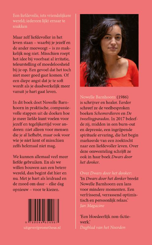 Een liefdevolle, iets vriendelijkere wereld; iedereen lijkt ernaar te snakken. Maar zelf liefdevoller in het leven staan – waarbij je jezelf en de ander meeweegt – is zo makkelijk nog niet. Misschien roept het idee bij voorbaat al teleurstelling, boosheid of moedeloosheid bij je op. Een gevoel dat het toch niet meer goed gaat komen, of een diepe angst dat je te soft wordt als je daadwerkelijk meer vanuit je hart gaat leven. In dit boek doet Nowelle Barnhoorn in praktische, compassievolle stappen uit de doeken hoe je meer liefde kunt voelen voor jezelf en tegelijkertijd voor anderen: niet alleen voor mensen die je al liefhebt, maar ook voor wie je niet kent of misschien zelfs helemaal niet mag. We kunnen allemaal veel meer liefde gebruiken. En als we willen bouwen aan een betere wereld, dan begint dat hier en nu. Met een geloof in de liefde en de moed om daarvoor te kiezen. Nowelle Barnhoorn (1986) is schrijver en healer. Eerder schreef ze de veelbesproken boeken Schemerdieren en De tweelingparadox. In 2017 kwam zij uit haar burn-out en depressie door een verlichtingservaring, waarna voor haar een zoektocht naar een liefdevoller leven begon. Over deze spirituele omwenteling schrijft ze ook in haar boek Dwars door het donker. Over Dwars door het donker: ‘In Dwars door het donker breekt Nowelle Barnhoorn een lans voor mindere momenten. Een verfrissend, verrassend optimistisch en persoonlijk relaas.’ Jan Magazine ‘Een bloedeerlijk non-fictiewerk.’ Dagblad van het Noorden