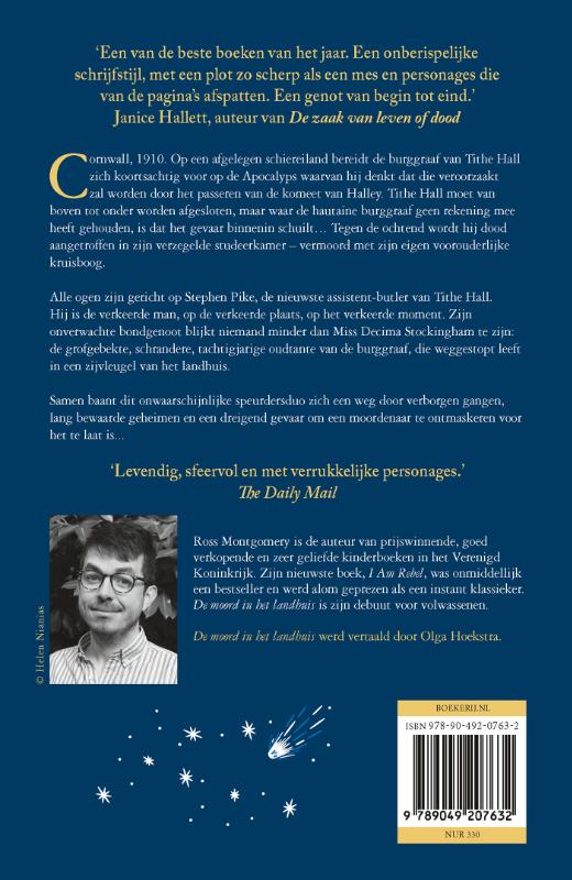 Een smeuïge standalone voor de fans van De moordclub (op donderdag) en Downton Abbey Een onwaarschijnlijk speurdersduo baant zich een weg door verborgen gangen, lang bewaarde geheimen en een dreigend gevaar om een moordenaar te ontmaskeren voor het te laat is Cornwall, 1910. Op een afgelegen eiland bereidt de burggraaf van Tithe Hall zich koortsachtig voor op de apocalyps, waarvan hij denkt dat die gepaard zal gaan met het passeren van de komeet Halley. Tithe Hall moet van boven tot onder worden afgesloten, maar wat de pompeuze burggraaf niet heeft overwogen, is dat het gevaar binnenin schuilt… Tegen de ochtend wordt hij dood aangetroffen in zijn verzegelde studeerkamer, vermoord met zijn eigen voorouderlijke kruisboog. Alle ogen zijn gericht op Steven Pike, de nieuwste onderbutler van Tithe Hall. Hij is de verkeerde man op de verkeerde plaats op het verkeerde moment. Zijn onwaarschijnlijke bondgenoot blijkt niemand minder dan Miss Decima Stockingham te zijn, de grofgebekte, scherpe tachtigjarige oudtante van de graaf, die ook in Tithe Hall woont. Samen baant dit onwaarschijnlijke speurdersduo zich een weg door verborgen gangen, lang bewaarde geheimen en een dreigend gevaar om een moordenaar te ontmaskeren voor het te laat is. Over de boeken van Ross Montgomery: ‘Zin in een thriller met een Downton Abbey -achtige sfeer? Laat je door Ross Montgomery meenemen naar Cornwall, 1910.’ Margriet ‘Levendig, sfeervol en met verrukkelijke personages.’ The Daily Mail 'Voor liefhebbers van Downton Abbey en de klassieke mysteries van Agatha Christie is deze cozy thriller een aanrader.'*****vrouwenthrillers.nl ‘Een instantklassieker. Uitstekend geschreven en een erg avontuurlijk verhaal – Montgomery heeft een heel nieuw niveau bereikt.’ Katya Balen, kinderboekenauteur ‘Een verhalenverteller van een andere klasse.’ The Bookseller