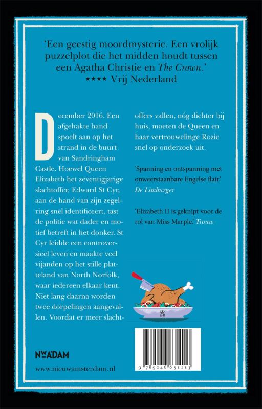 ‘Een geestig moordmysterie. (…) Een vrolijk puzzelplot die het midden houdt tussen een Agatha Christie en The Crown .’ Vrij Nederland **** December 2016. Een afgehakte hand spoelt aan op het strand in de buurt van Sandringham Castle. Hoewel Queen Elizabeth het zeventigjarige slachtoffer, Edward St Cyr, aan de hand van zijn zegelring snel identificeert, tast de politie wat dader en motief betreft in het donker. St Cyr leidde een controversieel leven en maakte veel vijanden op het stille platteland van North Norfolk, waar iedereen elkaar kent. Niet lang daarna worden twee dorpelingen aangevallen. Voordat er meer slachtoffers vallen, nóg dichter bij huis, moeten de Queen en haar vertrouwelinge en assistente Rozie snel op onderzoek uit… Deel 3 in de Hare Majesteit onderzoekt-serie, waarin Queen Elizabeth in het geheim mysteries oplost. ‘Amusante serie.’ Margriet ‘Elizabeth II is geknipt voor de rol van Miss Marple.’ Trouw ‘Spanning en ontspanning met onweerstaanbare Engelse flair.’ De Limburger