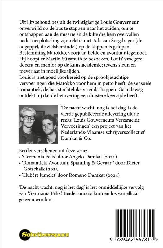 Uit lijfsbehoud besluit de twintigjarige Louis Gouverneur onverwijld op de bus te stappen naar het zuiden, om te ontsnappen aan de miserie en de kilte die hem overvallen nadat oerplotseling zijn relatie met Adriaan Sorgdrager (de oogappel, de zielsbeminde!) op de klippen is gelopen. Bestemming Marokko, voorjaar, liefde en avontuur tegemoet. Hij hoopt er Martin Süssmuth te bezoeken, Louis’ vroegere docent en mentor op de kunstacademie; tevens steun en toeverlaat in moeilijke tijden. Louis is niet goed voorbereid op de sprookjesachtige vervoeringen die Marokko voor hem in petto heeft: de sensuele romantiek, de hartstochtelijke vriendschappen. Gaandeweg ontdekt hij dat de betovering een duistere keerzijde heeft. ‘De nacht wacht, nog is het dag’ is het vierde deel uit de reeks ‘Louis Gouverneurs Verzamelde Vervoeringen’, een project van het Nederlands-Vlaamse schrijverscollectief Damkat & Co. Eerder verschenen bij Schrijverspunt uit deze serie: ‘Germania Felix’ door Angelo Damkat (2021) ‘Romantiek, Avontuur, Spanning & Gevaar!’ door Dieter Gotschalk (2023) ‘Hubèrt Jumelet’ door Romano Damkat (2024) ‘De nacht wacht, nog is het dag’ is het onmiddellijke vervolg van ‘Germania Felix’; beide romans kunnen los van elkaar gelezen worden.