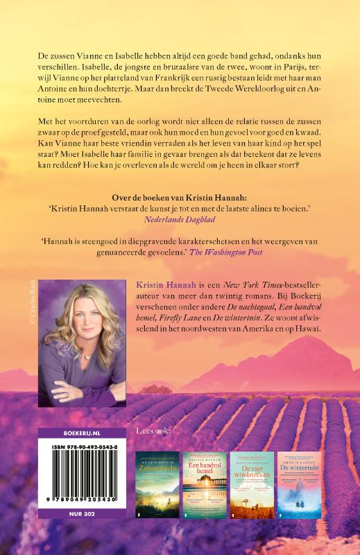 ‘Klassieker, een van de mooiste oorlogsboeken.’ Libelle De zussen Viann en Isabelle hebben altijd een goede band gehad, ondanks hun verschillen. Isabelle, de jongste en brutaalste van de twee, woont in Parijs, terwijl Viann op het platteland van Frankrijk een rustig bestaan leidt met haar man Antoine en hun dochtertje. Maar dan breekt de Tweede Wereldoorlog uit en Antoine moet meevechten. Met het voortduren van de oorlog wordt niet alleen de relatie tussen de zussen zwaar op de proef gesteld, maar ook hun moed en hun gevoel voor goed en fout. Kan Viann haar beste vriendin verraden als het leven van haar kind op het spel staat? Moet Isabelle haar familie in gevaar brengen als dat betekent dat ze levens kan redden? Hoe kan je overleven als de wereld om je heen in elkaar stort?