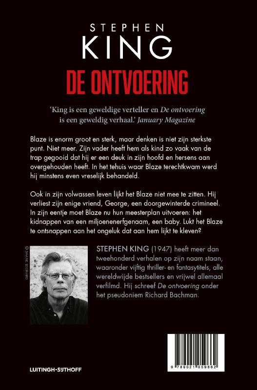 In De ontvoering van bestsellerauteur Stephen King verandert de misdaad van de eeuw al snel in een race tegen de klok… Blaze is enorm groot en sterk, maar denken is niet zijn sterkste punt. Niet meer. Zijn vader heeft hem als kind zo vaak van de trap gegooid, dat hij er een deuk in zijn hoofd en hersens aan overgehouden heeft. In het tehuis waar Blaze terechtkwam, werd hij minstens even vreselijk behandeld. Ook in zijn volwassen leven lijkt het Blaze niet mee te zitten. Hij verliest zijn enige vriend, George, een doorgewinterde crimineel. In zijn eentje moet hij nu hun meesterplan uitvoeren: het kidnappen van een miljoenenerfgenaam, een baby. Lukt het Blaze te ontsnappen aan het ongeluk dat aan hem lijkt te kleven? 'King is een geweldige verteller en De ontvoering is een geweldig verhaal.' January Magazine