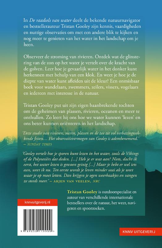 In 'De raadsels van water' deelt de bekende natuurnavigator en bestsellerauteur Tristan Gooley zijn kennis, vaardigheden en nuttige observaties om met een andere blik te kijken en nog meer te genieten van het water in het landschap om je heen. Observeer de stroming van rivieren. Ontdek wat de glinstering van de zon op het water je vertelt over de kracht van de golven. Leer hoe je gevaarlijk water in het donker kunt herkennen met behulp van een klok. En weet je hoe je de diepte van water kunt afleiden uit de kleur? Een onmisbaar boek voor wandelaars, zwemmers, zeilers, vissers, vogelaars en iedereen met interesse in de natuur. Tristan Gooley put uit zijn eigen baanbrekende tochten om de geheimen van plassen, rivieren, oceanen en meer te onthullen. Zo leert hij ons hoe we water kunnen ‘lezen’ en ons beter kunnen oriënteren in het landschap. Bekende navigatie-expert en bestsellerauteur Leer meer dan 700 signalen en patronen Kijk op een andere manier naar het landschap ‘Deze inspirerende gids over water in al zijn vormen maakt veel indruk… Gooley doet het onderwerp eer aan – dit is écht fascinerende materie.’ – The Times ‘Deze studie van rivieren, meren, plassen en de zee zit vol verbazingwekkende feiten… Het observatievermogen van Gooley is adembenemend.’ – The Sunday Times ‘Gooley vertelt hoe je sporen kunt lezen in het water, zoals de Vikings of de Polynesiërs dat deden [...] Heb je er iets aan? Niets, dacht ik eerst, het water lezen is gewoon geinig [...] Maar je hebt er wel iets aan, weet ik nu. Ten eerste wordt je leven minder saai als je weet waar je op moet letten. Dan krijgen je ogen weerhaakjes en vangen ze steeds meer.’ – Arjen van Veelen, NRC Tristan Gooley is navigatie expert, wandelaar, oceaanzeiler en piloot. Hij houdt zich al jaren bezig met natuurlijke navigatie en wordt ook ‘Sherlock Holmes van de natuur’ genoemd. Hij heeft zijn eigen school voor natuurlijk navigeren en schreef meerdere boeken over dit onderwerp. Eerder verschenen Gooley titels: ‘De Outdoorgids voor wandelaars’, ‘De geheimen van het weer’, ‘De natuur als kompas’.