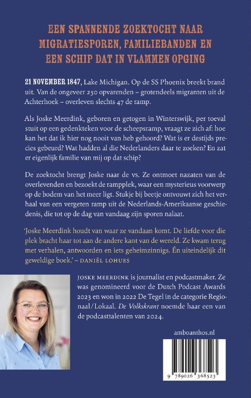 21 november 1847, Lake Michigan. Op de SS Phoenix breekt brand uit. Van de ongeveer 250 opvarenden – grotendeels migranten uit deAchterhoek – overleven slechts 47 de ramp. Als Joske Meerdink, geboren en getogen in Winterswijk, per toeval stuit op een gedenkteken voor de scheepsramp, vraagt ze zich af: hoe kan het dat ik hier nog nooit van heb gehoord? Wat is er destijds precies gebeurd? Wat hadden al die Nederlanders daar te zoeken? En zat er eigenlijk familie van mij op dat schip? De zoektocht brengt Joske naar de VS. Ze ontmoet nazaten van de overlevenden en bezoekt de rampplek, waar een mysterieus voorwerp op de bodem van het meer ligt. Nieuwsgierig en bezield vertelt ze het verhaal van een vergeten ramp, die zijn sporen nalaat in het heden.