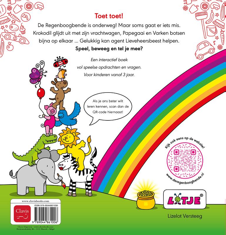 Toet toet! De Regenboogbende is onderweg! Maar soms gaat er iets mis. Krokodil glijdt uit met zijn vrachtwagen, Papegaai en Varken botsen bijna op elkaar ... Gelukkig kan agent Lieveheersbeest helpen. Speel, beweeg en tel je mee? Een interactief boek vol speelse opdrachten en vragen. Voor kinderen vanaf 3 jaar.