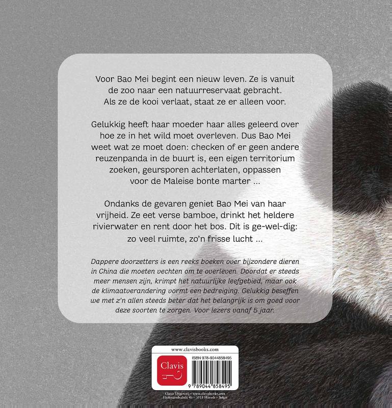Voor Bao Mei begint een nieuw leven. Ze is vanuit de zoo naar een natuurreservaat gebracht. Als ze de kooi verlaat, staat ze er alleen voor. Gelukkig heeft haar moeder haar alles geleerd over hoe ze in het wild moet overleven. Dus Bao Mei weet wat ze moet doen: checken of er geen andere reuzenpanda in de buurt is, een eigen territorium zoeken, geursporen achterlaten, oppassen voor de Maleise bonte marter … Ondanks de gevaren geniet Bao Mei van haar vrijheid. Ze eet verse bamboe, drinkt het heldere rivierwater en rent door het bos. Dit is ge-wel-dig: zo veel ruimte, zo’n frisse lucht … Dappere doorzetters is een reeks boeken over bijzondere dieren in China die moeten vechten om te overleven. Doordat er steeds meer mensen zijn, krimpt het natuurlijke leefgebied, maar ook de klimaatverandering vormt een bedreiging. Gelukkig zijn er steeds meer mensen die beseffen dat het belangrijk is om goed voor deze soorten te zorgen. Voor lezers vanaf 5 jaar.