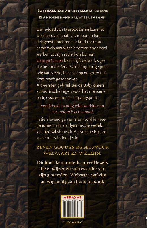 ‘Een trage hand krijgt leed en schand Een kloeke hand krijgt eer en land’ De invloed van Mesopotamië kan niet worden overschat. Grandeur en handelsgeest brachten het land tot duurzame welvaart waar iedereen door hard werken tot zijn recht kon komen. George Clason beschrijft de werkwijze die het oude Perzië zo’n langdurige periode van vrede, beschaving en grote rijkdom heeft geschonken. Als eersten gebruikten de Babyloniërs economische regels voor het mensenpark, codices met als uitgangspunt: eerlijkheid, handigheid, werklust en een woord is een woord. In tien levendige verhalen word je meegenomen naar de dynamische wereld van het Babylonisch-Assyrische Rijk en spelenderwijs leer je de zeven gouden regels voor welvaart en welzijn. Dit boek kent ontelbaar veel lezers die er wijzer en succesvoller van zijn geworden. Welvaart, welzijn en wijsheid gaan hand in hand.