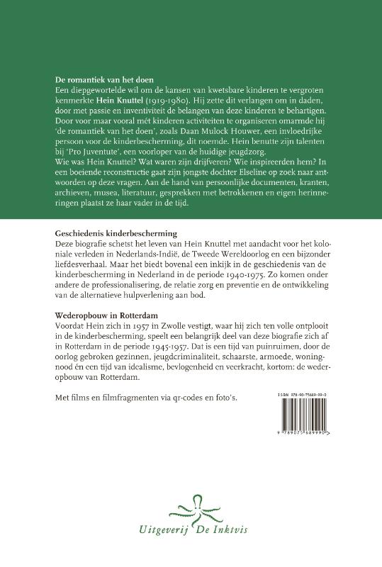 De romantiek van het doen Een diepgewortelde wil om de kansen van kwetsbare kinderen te vergroten kenmerkte Hein Knuttel (1919-1980). Hij zette dit verlangen om in daden, door met passie en inventiviteit de belangen van deze kinderen te behartigen. Door voor maar vooral mét kinderen activiteiten te organiseren omarmde hij ‘de romantiek van het doen’, zoals Daan Mulock Houwer, een invloedrijke persoon voor de kinderbescherming, dit noemde. Hein benutte zijn talenten bij ‘Pro Juventute’, een voorloper van de huidige jeugdzorg. Wie was Hein Knuttel? Wat waren zijn drijfveren? Wie inspireerden hem? In een boeiende reconstructie gaat zijn jongste dochter Elseline op zoek naar antwoorden op deze vragen. Aan de hand van persoonlijke documenten, kranten, archieven, musea, literatuur, gesprekken met betrokkenen en eigen herinneringen plaatst ze haar vader in de tijd. Geschiedenis kinderbescherming Deze biografie schetst het leven van Hein Knuttel met aandacht voor het koloniale verleden in Nederlands-Indië, de Tweede Wereldoorlog en een bijzondere liefdesgeschiedenis. Maar het biedt bovenal een inkijk in de geschiedenis van de kinderbescherming in Nederland in de periode 1940-1975. Zo komen onder andere de professionalisering, de relatie zorg en preventie en de ontwikkeling van de alternatieve hulpverlening aan bod. Wederopbouw in Rotterdam Voordat Hein zich in 1957 in Zwolle vestigt, waar hij zich ten volle ontplooit in de kinderbescherming, speelt een belangrijk deel van deze biografie zich af in Rotterdam in de periode 1945-1957. Dat is een tijd van puinruimen, gebroken gezinnen door de oorlog, jeugdcriminaliteit, schaarste, armoede, woningnood én een tijd van idealisme, bevlogenheid en veerkracht, kortom: de wederopbouw van Rotterdam.