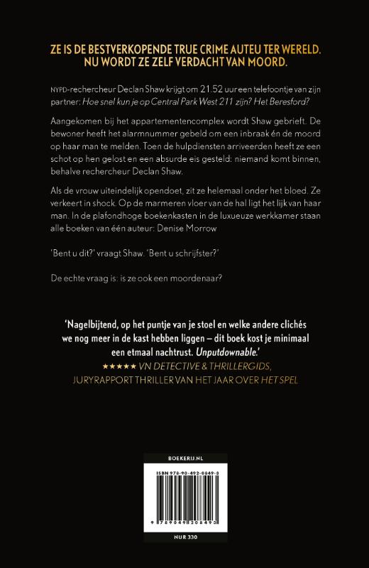 Een ijzersterke politiethriller voor de fans van M.J. Arlidge en Karin Slaughter Ze is de bestverkopende misdaadauteur ter wereld. Nu is ze zelf een moordverdachte. NYPD-rechercheur Declan Shaw krijgt om 21.42 uur een telefoontje van zijn luitenant: Hoe snel kan je bij 211 Central Park West zijn? Het Beresfordgebouw. Voor appartement 18a wordt Shaw gebriefd door zijn partner. De vrouw belde het alarmnummer om een inbraak te melden – en de moord op haar man. Ze vuurde een kogel af op hulpverleners en deed vervolgens een verbijsterende eis: niemand komt binnen, behalve rechercheur Declan Shaw. De vrouw doet open, haar lichaam bedekt met bloed. Ze lijkt in shock. Er ligt een lichaam op de vloer van de luxe woonkamer. Elk boek in de plafondhoge boekenkasten is van dezelfde auteur: Denise Morrow, truecrimebestsellerauteur. ‘Ben jij dit?’ vraagt Shaw. ‘Ben je een schrijver?’ De echte vraag is: is ze ook een moordenaar? Barker & Patterson in de pers ‘De bizarre plotwendingen volgen elkaar in een razendsnel tempo op. Zeer vermakelijk.’ Publishers Weekly over De schrijfster ‘Vanuit een pittig tempo accelereert het verhaal naar de snelheid van een op hol geslagen rollercoaster.’ VN Detective & Thrillergids ‘Als twee topthrillerÂschrijvers de krachten bundelen, moet het wel spannend worden!’ VROUW