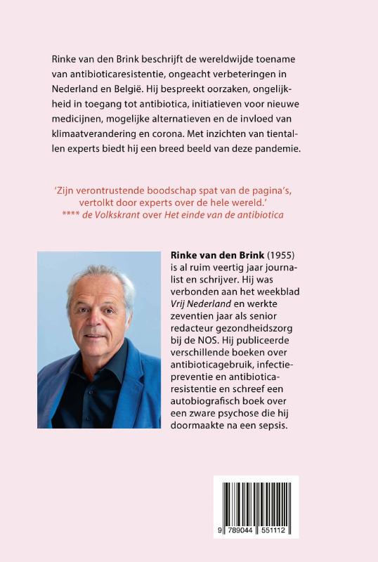 Rinke van den Brink beschrijft de wereldwijde toename van antibioticaresistentie, ongeacht verbeteringen in Nederland en België. Hij bespreekt oorzaken, ongelijkheid in toegang tot antibiotica, initiatieven voor nieuwe medicijnen, mogelijke alternatieven en de invloed van klimaatverandering en corona. Met inzichten van tientallen experts biedt hij een breed beeld van deze pandemie. ‘Zijn verontrustende boodschap spat van de pagina’s, vertolkt door experts over de hele wereld.’ – **** de Volkskrant over Het einde van de antibiotica