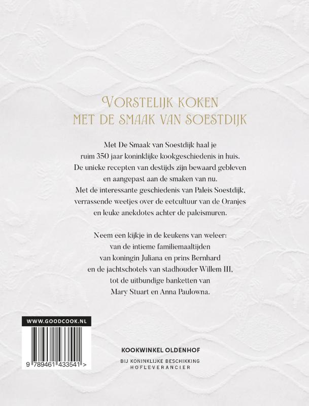 Vorstelijk koken met De Smaak van Soestdijk Met De Smaak van Soestdijk haal je ruim 350 jaar koninklijke kookgeschiedenis in huis. De unieke recepten van destijds zijn bewaard gebleven en aangepast aan de smaken van nu. Met de interessante geschiedenis van Paleis Soestdijk, verrassende weetjes over de eetcultuur van de Oranjes en leuke anekdotes achter de paleismuren. Neem een kijkje in de keukens van weleer: van de intieme familiemaaltijden van koningin Juliana en prins Bernhard en de jachtschotels van stadhouder Willem III, tot de uitbundige banketten van Mary Stuart en Anna Paulowna.