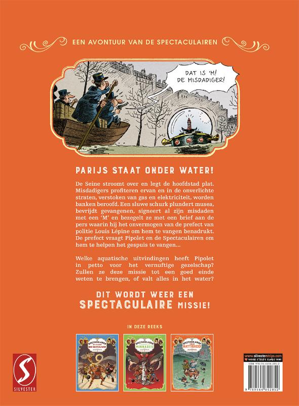 Krachtpatser, menselijke kanonskogel, messenwerper en weerwolf. De leden van dit vrolijke gezelschap hebben allemaal een talent... om spectaculair te zijn. De Spectaculairen zijn de Avengers van Parijs anno 1910! Parijs, januari 1910. De Seine stroomt over, zet alle wijken onder water en legt de hoofdstad volledig plat. Misdadigers profiteren ervan en in de onverlichte straten, verstoken van gas en elektriciteit, worden winkels beroofd en bewoners overvallen. Een getalenteerde schurk, die zich ‘de moeraal’ laat noemen, plundert musea, bevrijdt gevangenen, signeert al zijn misdaden met een M en bezegelt ze met een brief aan de pers waarin hij het onvermogen van de prefect van politie Louis Lépine om hem te vangen benadrukt. De president vraagt Pipolet om hem samen met de Spectaculairen te hulp te schieten. Welke nieuwe aquatische uitvindingen heeft Pipolet in petto voor het vernuftige gezelschap? Zullen ze deze missie tot een goed einde weten te brengen, of valt alles in het water Ieder deel van 'De Spectaculairen' is een afgerond verhaal.