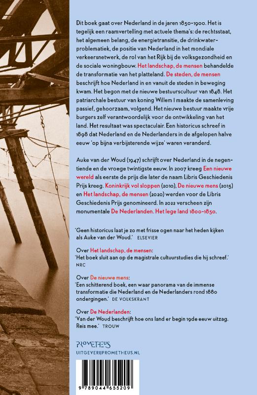 Dit boek gaat over Nederland in de jaren 1850-1900, geschiedenis. En tegelijk een raamvertelling met actuele thema’s: de rechtsstaat, het algemeen belang, de energietransitie, de drinkwaterproblematiek, de positie van Nederland in het mondiale verkeersnetwerk, de rol van het rijk bij de volksgezondheid en de sociale woningbouw. Het landschap, de mensen behandelde de transformatie van het platteland. De steden, de mensen beschrijft hoe Nederland in en vanuit de steden in beweging kwam. Het begon met de nieuwe bestuurscultuur van 1848. Het patriarchale bestuur van koning Willem I maakte de samenleving passief, gehoorzaam, volgend. Het nieuwe bestuur maakte vrije burgers zelf verantwoordelijk voor de ontwikkeling van het land. Het resultaat was spectaculair. Een historicus schreef in 1898 dat Nederland en de Nederlanders in de afgelopen halve eeuw ‘op bijna verbijsterende wijze’ waren veranderd. Auke van der Woud (1947) schrijft over Nederland in de negentiende en de vroege twintigste eeuw. In 2007 kreeg Een nieuwe wereld als eerste de prijs die later de naam Libris Geschiedenis Prijs kreeg. Koninkrijk vol sloppen (2010), De nieuwe mens (2015) en Het landschap, de mensen (2020) werden voor de Libris Geschiedenis Prijs genomineerd. In 2022 verscheen zijn monumentale De Nederlanden. Het lege land 1800-1850. ‘Geen historicus laat je zo met frisse ogen naar het heden kijken als Auke van der Woud.’ Elsevier Over Het landschap, de mensen: ‘Het boek sluit aan op de magistrale cultuurstudies die hij schreef.’ NRC Over De nieuwe mens: ‘Een schitterend boek, een waar panorama van de immense transformatie die Nederland en de Nederlanders rond 1880 ondergingen.’ de Volkskrant Over De Nederlanden: ‘Van der Woud beschrijft hoe ons land er begin 19de eeuw uitzag. Reis mee.’ Trouw Over Een nieuwe wereld: ‘Van der Woud laat haarfijn zien hoe deze samenleving is ontstaan, en welke krachten daarin werkzaam zijn.’ Historisch Nieuwsblad