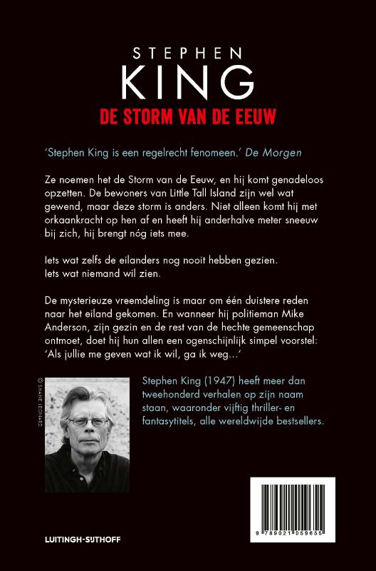 In De storm van de eeuw van Stephen King raken eilandbewoners verstrikt in een onheilspellende storm als er een vreemdeling arriveert met lugubere plannen. Ze noemen het de Storm van de Eeuw, en hij komt genadeloos opzetten. De bewoners van Little Tall Island zijn wel wat gewend, maar deze storm is anders. Niet alleen komt hij met orkaankracht op hen af en heeft hij anderhalve meter sneeuw bij zich, hij brengt nog iets mee. Iets wat zelfs de eilanders nog nooit hebben gezien. Iets wat niemand wil zien. De mysterieuze vreemdeling is maar om één duistere reden naar het eiland gekomen. En wanneer hij politieman Mike Anderson, zijn gezin en de rest van de hechte gemeenschap ontmoet, doet hij hun allen een ogenschijnlijk simpel voorstel: ‘Als jullie me geven wat ik wil, ga ik weg…’ 'Stephen King is een regelrecht fenomeen.' De Morgen