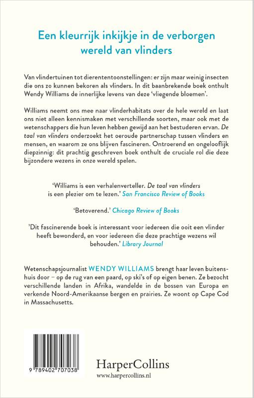 Een kleurrijk inkijkje in de verborgen wereld van vlinders Van vlindertuinen tot dierententoonstellingen: er zijn maar weinig insecten die ons zo kunnen bekoren als vlinders. In dit baanbrekende boek onthult Wendy Williams de innerlijke levens van deze ‘vliegende bloemen’. Williams neemt ons mee naar vlinderhabitats over de hele wereld en laat ons niet alleen kennismaken met verschillende soorten, maar ook met de wetenschappers die hun leven hebben gewijd aan het bestuderen ervan. De taal van vlinders onderzoekt het oeroude partnerschap tussen vlinders en mensen, en waarom ze ons blijven fascineren. Ontroerend en ongelooflijk diepzinnig: dit prachtig geschreven boek onthult de cruciale rol die deze bijzondere wezens in onze wereld spelen.