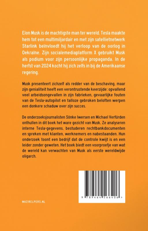 Elon Musk is de machtigste man ter wereld. Tesla maakte hem tot een multimiljardair, en met zijn satellietnetwerk Starlink beïnvloedt hij het verloop van de oorlog in Oekraïne. Zijn socialemediaplatform X gebruikt Musk als podium voor zijn persoonlijke propaganda. In de herfst van 2024 kocht hij zich zelfs in bij de Amerikaanse regering. Musk presenteert zichzelf als redder van de beschaving, maar zijn genialiteit heeft een verontrustende keerzijde: opvallend veel arbeidsongevallen in zijn fabrieken, gevaarlijke fouten van de Tesla-autopilot en talloze gebroken beloften werpen een donkere schaduw over zijn succes. De onderzoeksjournalisten Sönke Iwersen en Michael Verfürden onthullen in dit boek het ware gezicht van Musk. Ze analyseren interne Tesla-gegevens, bestuderen rechtbankdocumenten en spreken met klanten, werknemers en nabestaanden. Hun onderzoek toont een bedrijf dat de controle kwijt is en een leider zonder geweten. Het boek biedt een voorproefje van wat de wereld kan verwachten van Musk als eerste wereldwijde oligarch.