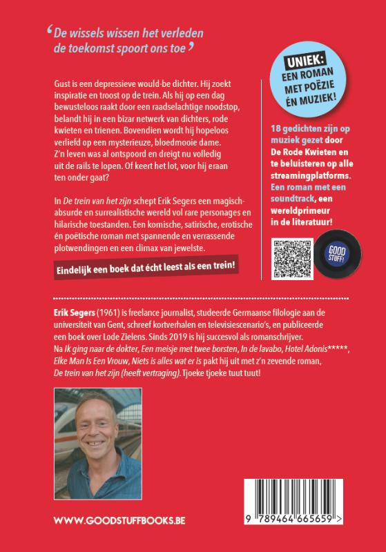 'de wissels wissen het verleden de toekomst spoort ons toe’ +++ Gust is een depressieve would-be dichter. Hij zoekt inspiratie en troost op de trein. Als hij op een dag bewusteloos raakt door een raadselachtige noodstop, belandt hij in een bizar netwerk van dichters, rode kwieten en trienen. Bovendien wordt hij hopeloos verliefd op een mysterieuze, bloedmooie dame. Z’n leven was al ontspoord en dreigt nu volledig uit de rails te lopen. Of keert het lot, voor hij eraan ten onder gaat? In ‘De trein van het zijn’ schept Erik Segers een magisch-absurde en surrealistische wereld vol rare personages en hilarische toestanden. Een komische, satirische, erotische én poëtische roman met spannende en verrassende plotwendingen en een climax van jewelste. Eindelijk een boek dat écht leest als een trein! +++ Uniek: een roman met poëzie én muziek! 18 gedichten zijn op muziek gezet door De Rode Kwieten en te beluisteren op alle streamingplatforms. Een roman met een soundtrack, een wereldprimeur in de literatuur! +++ Erik Segers (1961) is freelance journalist, studeerde Germaanse filologie aan de universiteit van Gent, schreef kortverhalen en televisiescenario’s, en publiceerde een boek over Lode Zielens. Sinds 2019 is hij succesvol als romanschrijver. Na ‘Ik ging naar de dokter’, ‘Een meisje met twee borsten’, ‘In de lavabo’, ‘Hotel Adonis*****’, ‘Elke man is een vrouw’ en ‘Niets is alles wat er is’ pakt hij uit met z’n zevende roman, ‘De trein van het zijn (heeft vertraging)’. Tjoeke tjoeke tuut tuut!