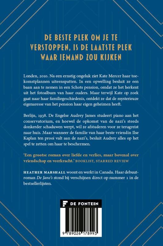 Londen, 2010. Na een ernstig ongeluk ziet Kate Mercer haar toekomstplannen uiteenspatten. In een opwelling besluit ze een baan aan te nemen in een Schots pension, omdat ze het herkent van de foto’s in haar ouders fotoalbum. Maar terwijl Kate op zoek gaat naar haar eigen wortels, ontdekt ze dat de mysterieuze eigenaresse van het pension haar eigen geheimen heeft. Berlijn, 1938. De Engelse Audrey James studeert piano, en hoewel de opkomst van de nazi’s steeds donkerder schaduwen werpt, wil ze haar examens afleggen voor ze terugreist naar huis. Maar wanneer de familie van haar beste vriendin Ilse Kaplan ten prooi valt aan de nazi’s, besluit Audrey alles op het spel te zetten om haar te beschermen. Geïnspireerd op waargebeurde verhalen over het Duitse verzet in de Tweede Wereldoorlog, schreef Heather Marshall een fascinerend roman over moed, vriendschap en idealen.
