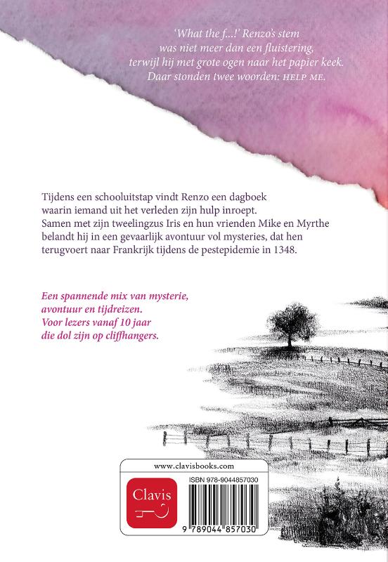 ‘What the f...!’ Renzo’s stem was niet meer dan een fluistering, terwijl hij met grote ogen naar het papier keek. Daar stonden twee woorden: HELP ME. Tijdens een schooluitstap vindt Renzo een dagboek waarin iemand uit het verleden zijn hulp inroept. Samen met zijn tweelingzus Iris en hun vrienden Mike en Myrthe belandt hij in een gevaarlijk avontuur vol mysteries, dat hen terugvoert naar Frankrijk tijdens de pestepidemie in 1348. Een spannende mix van mysterie, avontuur en tijdreizen. Voor lezers vanaf 12 jaar die dol zijn op cliffhangers.