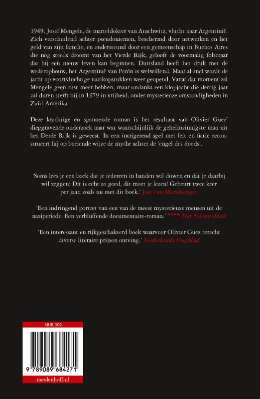 Deze spannende, spectaculaire roman over het voortvluchtige bestaan van nazi-kopstuk Josef Mengele is nu verfilmd! Een intrigerend spel met feit en fictie, een aanrader voor de liefhebbers van HhhH van Laurent Binet 1949. Josef Mengele, de marteldokter van Auschwitz, arriveert na zijn vlucht in Argentinië. Zich verschuilend achter pseudoniemen, beschermd door netwerken en het geld van zijn familie, en ondersteund door een gemeenschap in Buenos Aires die nog steeds droomt van het Vierde Rijk, gelooft de voormalig folteraar dat hij een nieuw leven kan beginnen. Duitsland heeft het druk met de wederopbouw, het Argentinië van Perón is welwillend. Maar al snel wordt de jacht op voortvluchtige nazi-kopstukken weer geopend. Vanaf dat moment zal Mengele geen moment rust meer hebben, maar ondanks een klopjacht van dertig jaar sterft hij in 1979 onder mysterieuze omstandigheden in Zuid-Amerika maar nog steeds in vrijheid. Deze krachtige roman is het resultaat van Olivier Guez’ diepgravend onderzoek naar wat waarschijnlijk de meest geheimzinnige man uit het Derde Rijk is geweest en reconstrueert op boeiende wijze de mythe achter de ‘Engel des doods’. In de pers ‘Een boek waarbij je als lezer van de ene in de andere emotie verzeild raakt. Afschuw, verbijstering en instemming wisselen zich af.’ **** NRC ‘Knappe biografie en gestoffeerd tijdsbeeld. IJselijk accuraat.’ De Morgen ‘Guez maakt een eind aan valse mythes. Zijn roman onthult de waarheid, niet zomaar een waarheid, maar de waarheid.’ ***** De Limburger