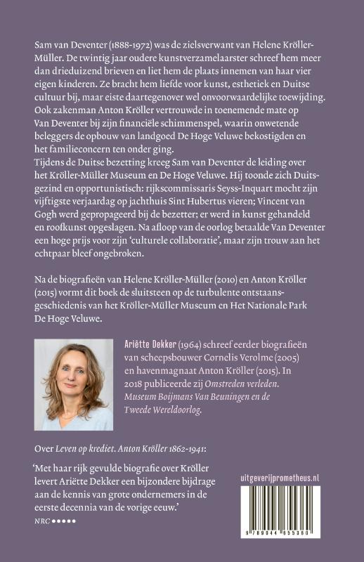 Sam van Deventer (1888-1972) stelde zijn leven in dienst van het echtpaar Kröller-Müller. Hij kwam in 1908 in hun leven en zou er nooit meer uit weggaan. De twintig jaar oudere Helene bracht hem liefde voor kunst, esthetiek en de Duitse cultuur bij. Ze wisselden meer dan drieduizend brieven. Sam van Deventer was echter ook secretaris van Anton Kröller, in wiens piramidespel op de beurs hij steeds verder verstrikt raakte, met de ondergang van familiebedrijf Müller & Co tot gevolg. Hij werd tot splijtzwam tussen het echtpaar. Tijdens de Tweede Wereldoorlog stelde de Duitsgezinde Van Deventer zich uiterst meegaand op. Hij stond rijkscommissaris Arthur Seyss-Inquart toe zijn vijftigste verjaardag op jachthuis Sint-Hubertus te vieren. Roofkunst werd opgeslagen in de schuilkelder van het museum. Na afloop van de oorlog betaalde Van Deventer een hoge prijs voor zijn ‘culturele collaboratie’. Zijn trouw aan het echtpaar bleef echter altijd ongebroken. Na de biografieën van Helene Kröller-Müller (2010) en Anton Kröller (2015) vormt dit boek de sluitsteen op de geschiedenis van de totstandkoming van het Kröller-Müller Museum en Het Nationale Park De Hoge Veluwe. Ariëtte Dekker (1964) schreef eerder biografieën van scheepsbouwer Cornelis Verolme (2005) en havenmagnaat Anton Kröller (2015). In 2018 publiceerde zij Omstreden verleden. Museum Boijmans Van Beuningen en de Tweede Wereldoorlog. Over Leven op krediet: ‘Met haar rijk gevulde biografie over Kröller levert Ariëtte Dekker een bijzondere bijdrage aan de kennis van grote ondernemers in de eerste decennia van de vorige eeuw.’ Menno Tamminga, NRC ••••• ‘Leven op krediet schildert een fascinerend beeld van het bedrijfsleven en de financiële wereld van een eeuw geleden en laat zien dat regulering op dit terrein allesbehalve een overbodige luxe is.’ Rob Hartmans, Historisch Nieuwsblad ‘Deze biografie is stukken evenwichtiger. Dat is Dekkers verdienste.’ Paul van der Steen, Trouw