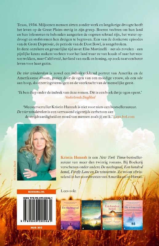Een indringend portret van een van Amerika’s meest bepalende tijdperken: de Grote Depressie van de jaren dertig Texas, 1934. Miljoenen mensen zitten zonder werk en langdurige droogte heeft het leven op de Great Plains stevig in zijn greep. Boeren vechten om hun land en hun inkomsten te behouden aangezien de oogsten schraal zijn, het water opdroogt en stofstormen hen dreigen te begraven. Een van de donkerste episodes van de -Grote Depressie, de periode van de Dust Bowl, is aangebroken. In deze onzekere en gevaarlijke tijd moet Elsa Martinelli – net als -zovelen – een pijnlijke keuze maken: vechten voor het land waar ze van houdt of naar het westen trekken, naar Californië, het land van melk en honing, op zoek naar een beter leven voor haar gezin. De vier windstreken is zowel een indrukwekkend portret van Amerika en de Amerikaanse droom, gezien door de ogen van een moedige vrouw, als een ode aan hoop, doorzettingsvermogen en de veerkracht van de menselijke geest. De vier windstreken in de pers ‘Zeer goed… Een rijk, voldoening gevend boek over familiebanden, doorzettingsvermogen, en vriendschappen en standvastigheid van vrouwen.’ Booklist (starred review) ‘De kracht van Hannahs proza brengt de personages tot leven op een manier die je aan de pagina’s gekluisterd houdt. Je zult hun overwinningen vieren, rouwen om hun tragedies, en hun moed prijzen.’ Associated Press ‘Een episch verhaal over ontberingen en liefde... Groots en meeslepend.’ USA Today