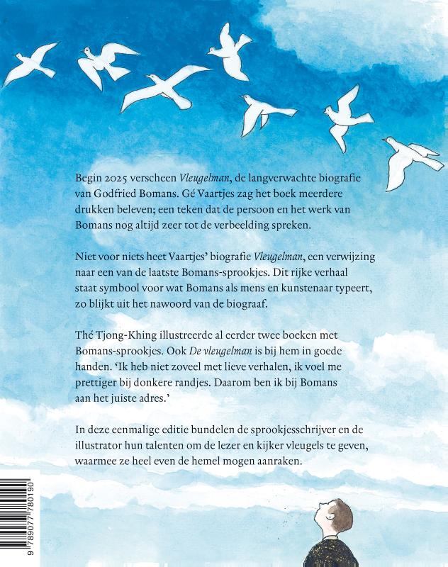 Begin 2025 verscheen Vleugelman, de langverwachte biografie van Godfried Bomans. Gé Vaartjes zag het boek meerdere drukken beleven; een teken dat de persoon en het werk van Bomans nog altijd zeer tot de verbeelding spreken. Niet voor niets heet Vaartjes’ biografie Vleugelman, een verwijzing naar een van de laatste Bomans-sprookjes. Dit rijke verhaal staat symbool voor wat Bomans als mens en kunstenaar typeert, zo blijkt uit het nawoord van de biograaf. Thé Tjong-Khing illustreerde al eerder twee boeken met Bomans-sprookjes. Ook De vleugelman is bij hem in goede handen. ‘Ik heb niet zoveel met lieve verhalen, ik voel me prettiger bij donkere randjes. Daarom ben ik bij Bomans aan het juiste adres.’ In deze eenmalige editie bundelen de sprookjesschrijver en de illustrator hun talenten om de lezer en kijker vleugels te geven, waarmee ze heel even de hemel mogen aanraken.