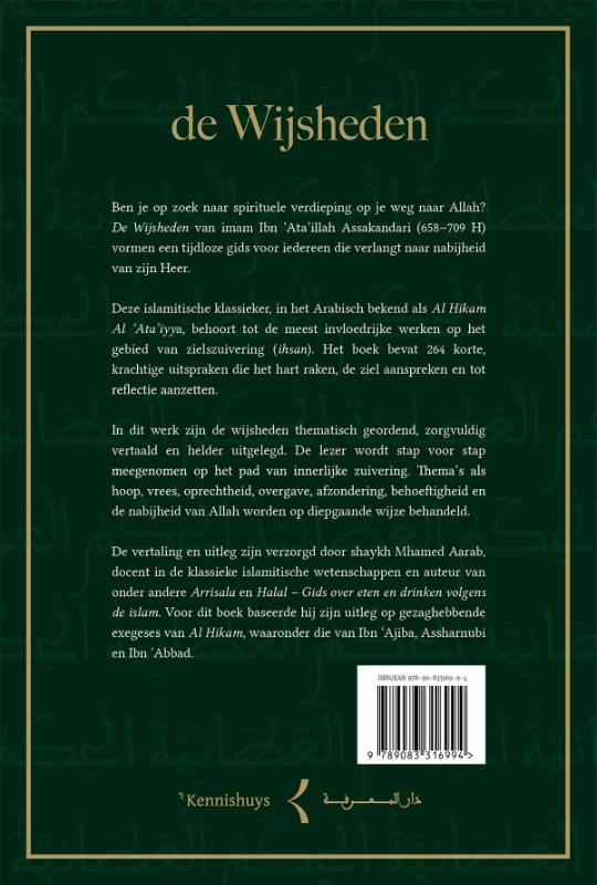 de Wijsheden – Al Hikam Al ‘Ata’iyya Een vertaling en uitleg van Al Hikam Al ‘Ata’iyya Over het boek “de Wijsheden” Ben je op zoek naar spirituele verdieping op je weg naar Allah? De Wijsheden van imam Ibn ‘Ata’illah Assakandari (658–709 H) vormen een tijdloze gids voor iedereen die verlangt naar nabijheid van zijn Heer. Deze islamitische klassieker, in het Arabisch bekend als Al Hikam Al ‘Ata’iyya, behoort tot de meest invloedrijke werken op het gebied van zielszuivering (ihsan). Het boek bevat 264 korte, krachtige uitspraken die het hart raken, de ziel aanspreken en tot reflectie aanzetten. In dit werk zijn de wijsheden thematisch geordend, zorgvuldig vertaald en helder uitgelegd. De lezer volgt stap voor stap het pad van innerlijke zuivering. Thema’s als hoop, vrees, oprechtheid, overgave, afzondering, behoeftigheid en de nabijheid van Allah komen op diepgaande wijze aan bod. Over de auteur van het boek “De Wijsheden” De vertaling en uitleg zijn verzorgd door shaykh Mhamed Aarab. Hij is docent in de klassieke islamitische wetenschappen en auteur van onder andere Arrisala en Halal. Voor dit boek baseerde hij zijn uitleg op gezaghebbende exegeses van Al Hikam, waaronder die van Ibn ‘Ajiba, Assharnubi en Ibn ‘Abbad. Kijk voor meer kwalitatieve islamboeken op onze boekenpagina. Hier vind je boeken over de islamitische geloofsleer (aqida), zielszuivering (ihsan), plichtenleer (fiqh) volgens de vier wetscholen (madhahib) evenals inspirerende islamitische kinderboeken.