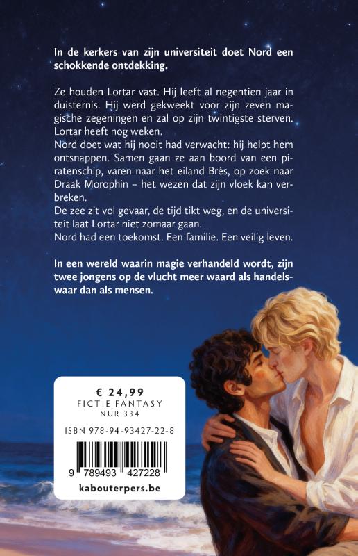 In de kelders van zijn universiteit ontdekt Nord een geheim. Ze houden Lortar vast, een jongen met zeven littekens op zijn rug. Hij is gekweekt voor zijn magische krachten. Als hij twintig wordt, sterft hij. Lortar heeft nog weken. Nord doet wat hij nooit had verwacht: hij helpt hem ontsnappen. Samen kapen ze een piratenschip en varen naar het eiland Brès, op zoek naar Draak Morophin – het wezen dat zijn vloek kan verbreken. De zee zit vol gevaar. De tijd tikt weg. De machthebbers laten hun eigendom niet zomaar gaan. Nord had een toekomst. Een familie. Een veilig leven. In een wereld waar magie verhandeld wordt, zijn twee jongens op de vlucht meer waard dood dan levend.