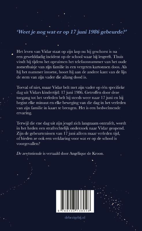 De ijzersterke nieuwe roman van de auteur van de moderne klassieker De overlevenden ! Het leven van Vidar staat op zijn kop nu hij geschorst is na een gewelddadig incident op de school waar hij lesgeeft. Thuis vindt hij tijdens het opruimen het telefoonnummer van het oude zomerhuisje van zijn familie in een vergeten kartonnen doos. Als hij het nummer intoetst, hoort hij aan de andere kant van de lijn de stem van zijn vader die allang dood is. Toeval of niet, maar Vidar belt met zijn vader op één specifi eke dag uit Vidars kindertijd: 17 juni 1986. Getroffen door deze toegang tot het verleden belt hij steeds weer naar 17 juni en hij begint elke minuut en elke beweging van die dag in het verleden van zijn familie in kaart te brengen. Het is een bedwelmende ervaring. Terwijl die ene dag uit zijn jeugd zich langzaam ontrafelt, wordt in het heden een strafrechtelijk onderzoek naar Vidar geopend. Zijn de gebeurtenissen van 17 juni alleen maar verleden tijd,of bieden ze ook een verklaring voor wat er op de school is voorgevallen?