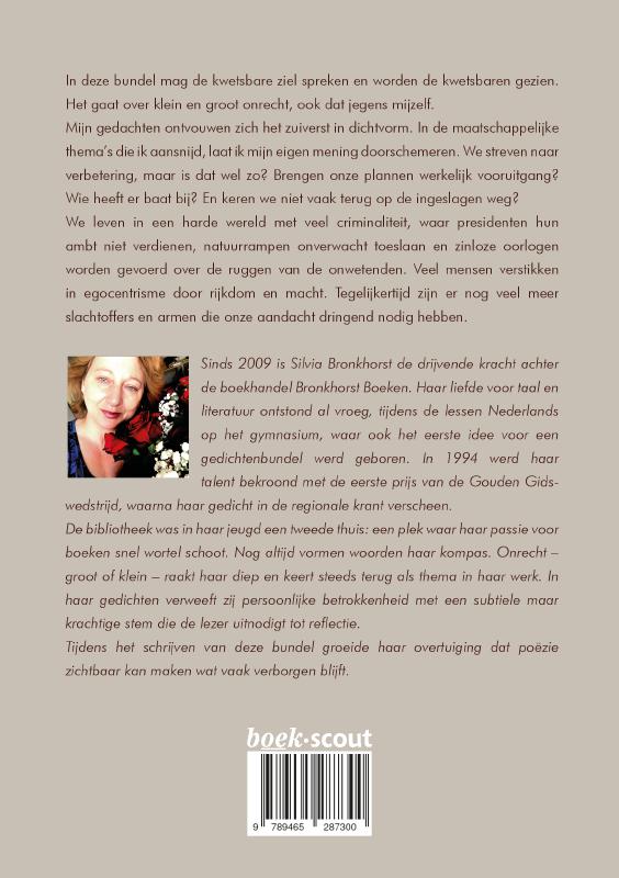 In deze bundel mag de kwetsbare ziel spreken en worden de kwetsbaren gezien. Het gaat over klein en groot onrecht, ook dat jegens mijzelf. Mijn gedachten ontvouwen zich het zuiverst in dichtvorm. In de maatschappelijke thema’s die ik aansnijd, laat ik mijn eigen mening doorschemeren. We streven naar verbetering, maar is dat wel zo? Brengen onze plannen werkelijk vooruitgang? Wie heeft er baat bij? En keren we niet vaak terug op de ingeslagen weg? We leven in een harde wereld met veel criminaliteit, waar presidenten hun ambt niet verdienen, natuurrampen onverwacht toeslaan en zinloze oorlogen worden gevoerd over de ruggen van de onwetenden. Veel mensen verstikken in egocentrisme door rijkdom en macht. Tegelijkertijd zijn er nog veel meer slachtoffers en armen die onze aandacht dringend nodig hebben.