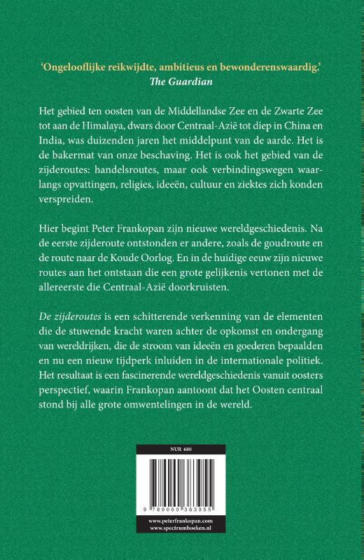 De bestseller  De zijderoutes van Peter Frankopan in een nieuw jasje 'Door terug te kijken, ver terug te kijken, houdt Frankopan ons een spiegel voor, die uiteindelijk haarscherp laat zien dat we ons zullen moeten aanpassen – of we nou willen of niet.' VPRO Tegenlicht De zijderoutes is een schitterende verkenning van de elementen die de stuwende kracht waren achter de opkomst en de ondergang van wereldrijken, die de stroom van ideeën en goederen bepaalden en nu een nieuw tijdperk inluiden in de internationale politiek. Het gebied ten oosten van de Middellandse en de Zwarte Zee tot aan de Himalaya, dwars door Centraal-Azië tot diep in China en India, was duizenden jaren het middelpunt van de aarde. Het is de bakermat van onze beschaving, waar meer dan 2500 jaar v.C. metropolen ontstonden als Harappa en Mohenjodaro met een bevolking die in de tienduizenden liep en met straten die waren aangesloten op een geavanceerd rioleringssysteem. Het is ook het gebied van de zijderoutes – handelsroutes maar ook verbindingswegen waarlangs opvattingen, religies, ideeën, cultuur én ziektes zich konden verspreiden. Hier begint Peter Frankopan zijn nieuwe wereldgeschiedenis. Na de eerste zijderoutes ontstonden er andere: de slavenroute, de goudroute, de route naar het zwarte goud. Maar in onze eenentwintigste eeuw zijn nieuwe routes aan het ontstaan die een grote gelijkenis vertonen met die allereerste, die Centraal-Azië doorkruisten. De zijderoutes komen terug! De pers over De zijderoutes : 'Briljante verhaallijnen (...) Een wereldgeschiedenis die het middelpunt van die wereld naar het oosten verplaatst.'  The Economist 'Veel boeken beweren "een nieuwe geschiedenis van de wereld" te zijn; dit boek heeft die benaming met recht.' The Times 'Frankopan schreef een erg stimulerend boek, dat tal van nieuwe inzichten biedt en bovendien bijzonder prettig leest.' Historisch Nieuwsblad Peter Frankopan is hoogleraar Wereldgeschiedenis aan Oxford University, waar hij ook Senior Research Fellow is aan Worcester College en directeur van het Centre for Byzantine Research. Hij is de auteur van de bestsellers De eerste kruistocht , De zijderoutes en De nieuwe zijderoutes .