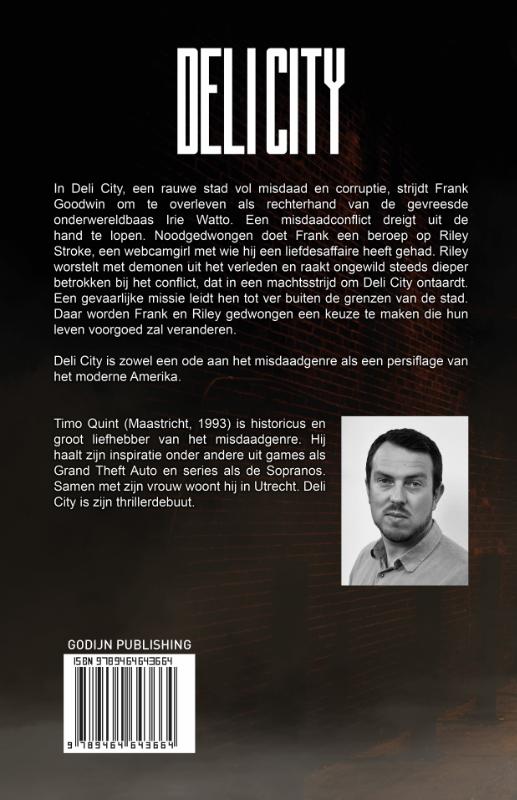 In Deli City, een rauwe stad vol misdaad en corruptie, strijdt Frank Goodwin om te overleven als rechterhand van de gevreesde onderwereldbaas Irie Watto. Een misdaadconflict dreigt uit de hand te lopen. Noodgedwongen doet Frank een beroep op Riley Stroke, een webcamgirl met wie hij een liefdesaffaire heeft gehad. Riley worstelt met demonen uit het verleden en raakt ongewild steeds dieper betrokken bij het conflict, dat in een machtsstrijd om Deli City ontaardt. Een gevaarlijke missie leidt hen tot ver buiten de grenzen van de stad. Daar worden Frank en Riley gedwongen een keuze te maken die hun leven voorgoed zal veranderen. Deli City is zowel een ode aan het misdaadgenre als een persiflage van het moderne Amerika. * Timo Quint (Maastricht, 1993) is historicus en groot liefhebber van het misdaadgenre. Hij haalt zijn inspiratie onder andere uit games als Grand Theft Auto en series als de Sopranos. Samen met zijn vrouw woont hij in Utrecht. Deli City is zijn thrillerdebuut.
