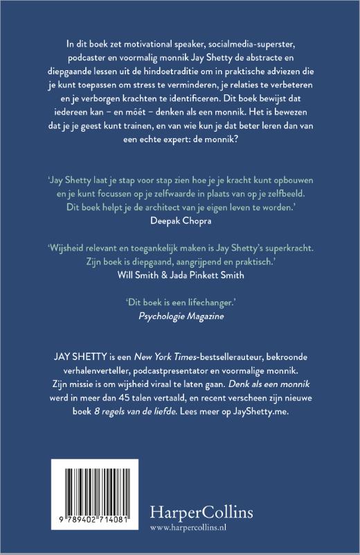 De wereldwijde bestseller van socialmediasuperster Jay Shetty. Word de architect van je eigen leven! Jay Shetty – motivational speaker, social-mediasuperster en presentator van de #1 podcast On Purpose – zet in Denk als een monnik de abstracte en diepgaande lessen uit de hindoetraditie om in praktische adviezen die je kunt toepassen om stress te verminderen, je relaties te verbeteren en je verborgen krachten te identificeren. Dit boek bewijst dat iedereen kan, en móét, denken als een monnik. Het is bewezen dat je je geest kunt trainen, en van wie kun je dat beter leren dan van een echte expert: de monnik? Jay Shetty vertrok op zijn tweeëntwintigste naar India om daar drie jaar als monnik te leven. Sindsdien is hij op een missie om zijn spirituele inzichten op een toegankelijke manier te delen. Zijn video’s zijn meer dan 5 miljard keer bekeken, en zijn podcast On Purpose is de meest beluisterde health-podcast ter wereld.