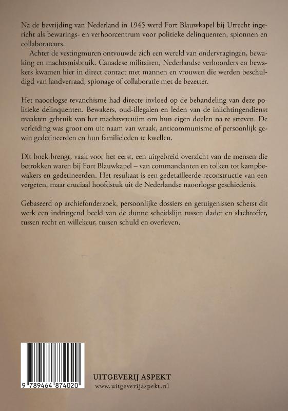 Na de bevrijding van Nederland in 1945 werd Fort Blauwkapel bij Utrecht ingericht als bewarings- en verhoorcentrum voor politieke delinquenten, spionnen en collaborateurs. Achter de vestingmuren ontvouwde zich een wereld van ondervragingen, bewaking en machtsmisbruik. Canadese militairen, Nederlandse verhoorders en bewakers kwamen hier in direct contact met mannen en vrouwen die werden beschuldigd van landverraad, spionage of collaboratie met de bezetter. Het naoorlogse revanchisme had directe invloed op de behandeling van deze politieke delinquenten. Bewakers, oud-illegalen en leden van de inlichtingendienst maakten gebruik van het machtsvacuüm om hun eigen doelen na te streven. De verleiding was groot om uit naam van wraak, anticommunisme of persoonlijk gewin gedetineerden en hun familieleden te kwellen. Dit boek brengt, vaak voor het eerst, een uitgebreid overzicht van de mensen die betrokken waren bij Fort Blauwkapel – van commandanten en tolken tot kampbewakers en gedetineerden. Het resultaat is een gedetailleerde reconstructie van een vergeten, maar cruciaal hoofdstuk uit de Nederlandse naoorlogse geschiedenis. Gebaseerd op archiefonderzoek, persoonlijke dossiers en getuigenissen schetst dit werk een indringend beeld van de dunne scheidslijn tussen dader en slachtoffer, tussen recht en willekeur, tussen schuld en overleven.
